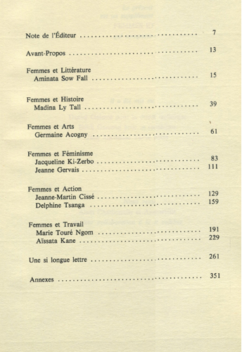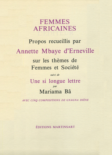 Annette Mbaye d'Erneville. Femmes africaines. Propos recueillis par Annette Mbaye d'Erneville sur les thèmes de Femmes et Société. Romorantin: Editions Martinsart, 1981. (364p.). Interviews de femmes de divers pays d'Afrique de l'Ouest et centrale.